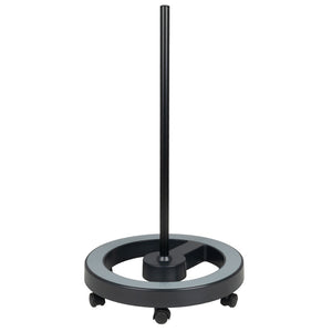 tripod is used to mount an elegante lamp. made of painted steel. installed wheels facilitate sliding on the floor.