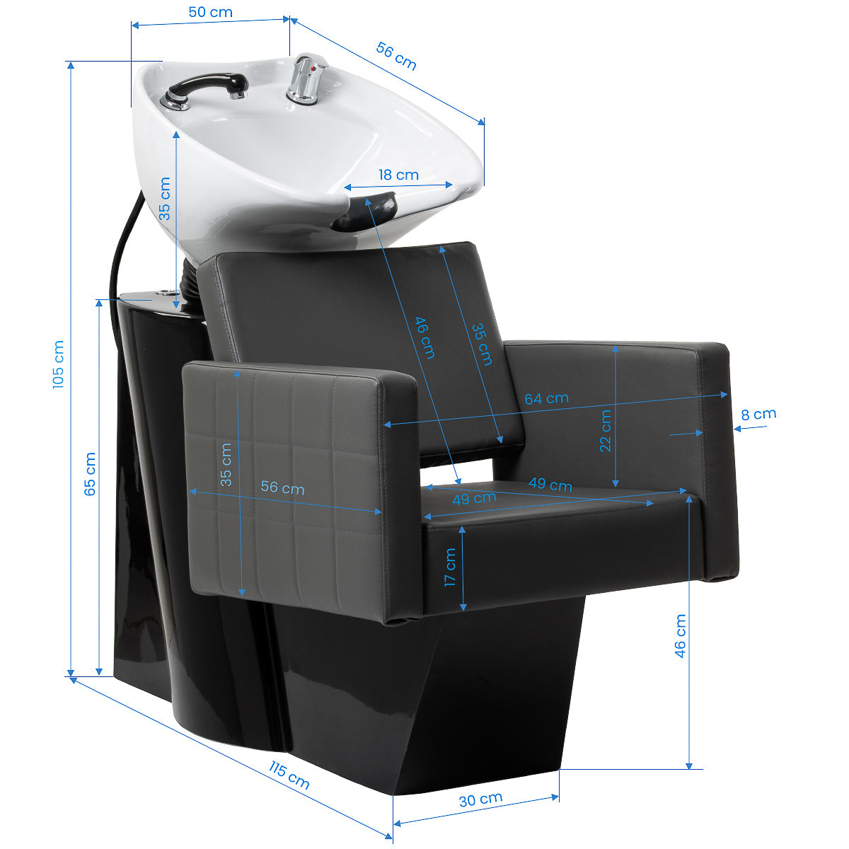The stylish Ankara hairdressing wash unit with a geometrically shaped chair supports efficient performance of hair care and washing treatments. It was designed with functional equipment of hairdressing salons in mind. The integrated design provides comfort for both hairdresser and client, and the careful workmanship with effective side stitching makes it a decoration of any interior.