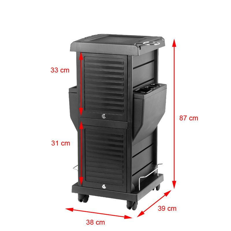 black hairdressing assistant with 2 lockable key shutters, 4 litter boxes and 15 compartments for hairdressing assortment. stable construction will ensure long-term use. table mounted on wheels, thanks to which the tools will always be at hand.