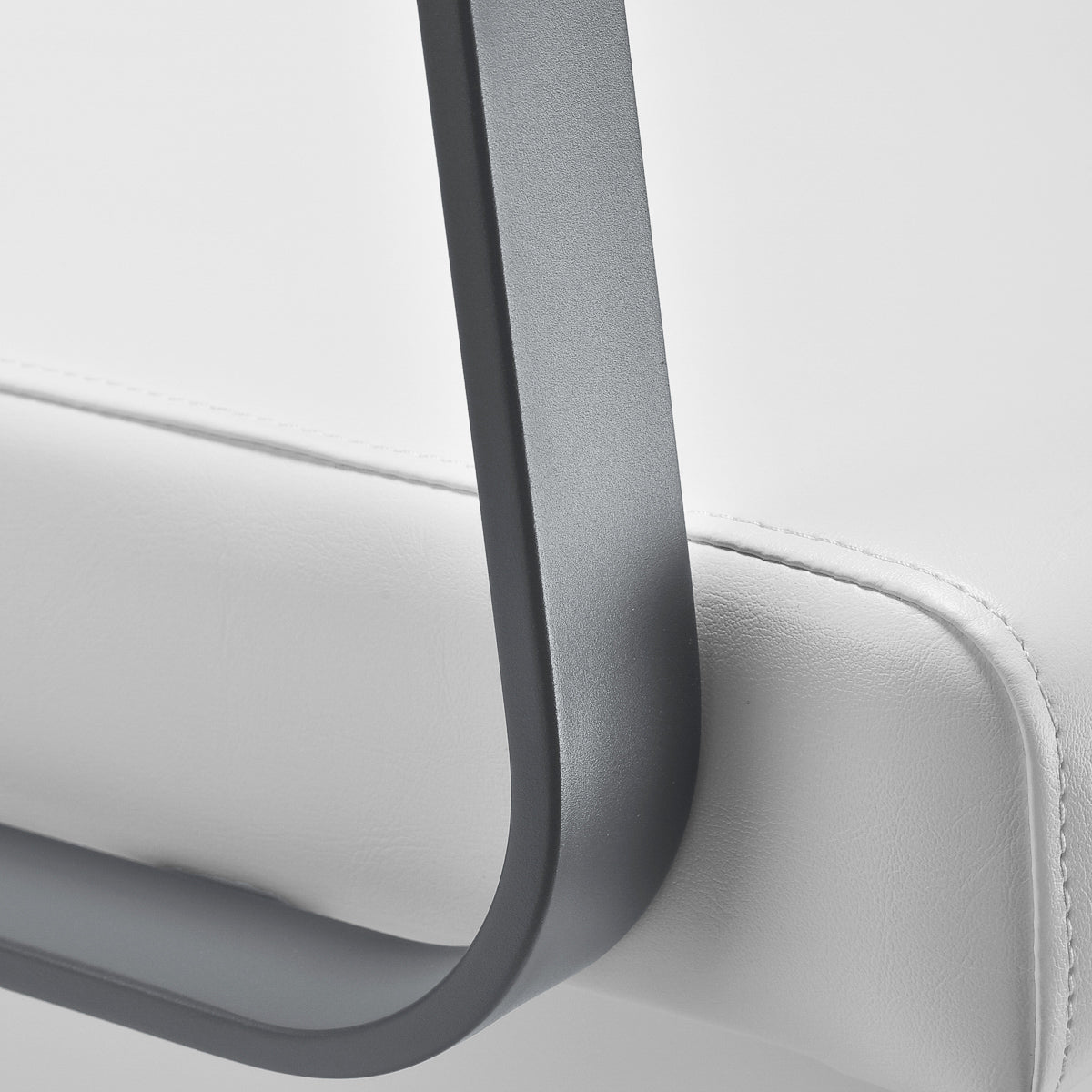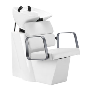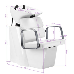 The profiled chair provides adequate lumbar support and, therefore, high comfort of use. Metal armrests in shades of gry with a geometric shape allow for the correct positioning of the customer's shoulders. Filling with durable, deformation-resistant foam and upholstery made of pleasant-to-touch synthetic leather in shades of white ensure the durability of the furniture, ease of cleaning and comfortable use for a long time. The original, elegant appearance of the hair wash unit gives the interior a unique expression. The set includes complete fittings in shades of black, including a faucet, a shower head and dedicated hoses to provide a complete set of tools for work.