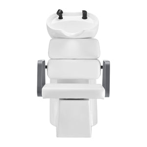 The appropriate depth of the white ceramic washbasin bowl prevents excessive splashing of water or products used during treatments. This allows for comfortable and effective performance of a wide range of services. The angle of the bowl can be adjusted, making it easy to adapt to individual needs. The high quality of the materials used makes the washbasin durable, resistant to discoloration and scratches, and very easy to clean. A properly profiled collar and inclined backrest provide support and comfort when washing the hair, and thanks to the comfortable black plastic overlay, the customer will not feel the unpleasantness of the cold ceramic surface.
