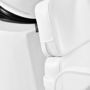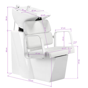 The profiled chair provides adequate lumbar support and, therefore, high comfort of use. Metal armrests in shades of white with a geometric shape allow for the correct positioning of the customer's shoulders. Filling with durable, deformation-resistant foam and upholstery made of pleasant-to-touch synthetic leather in shades of white ensure the durability of the furniture, ease of cleaning and comfortable use for a long time. The original, elegant appearance of the hair wash unit gives the interior a unique expression. The set includes complete fittings in shades of white, including a faucet, a shower head and dedicated hoses to provide a complete set of tools for work.