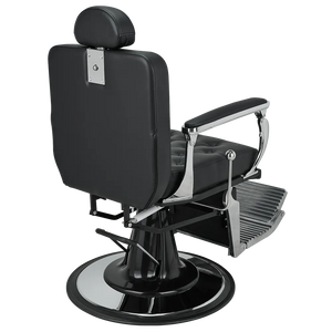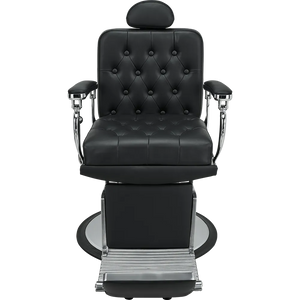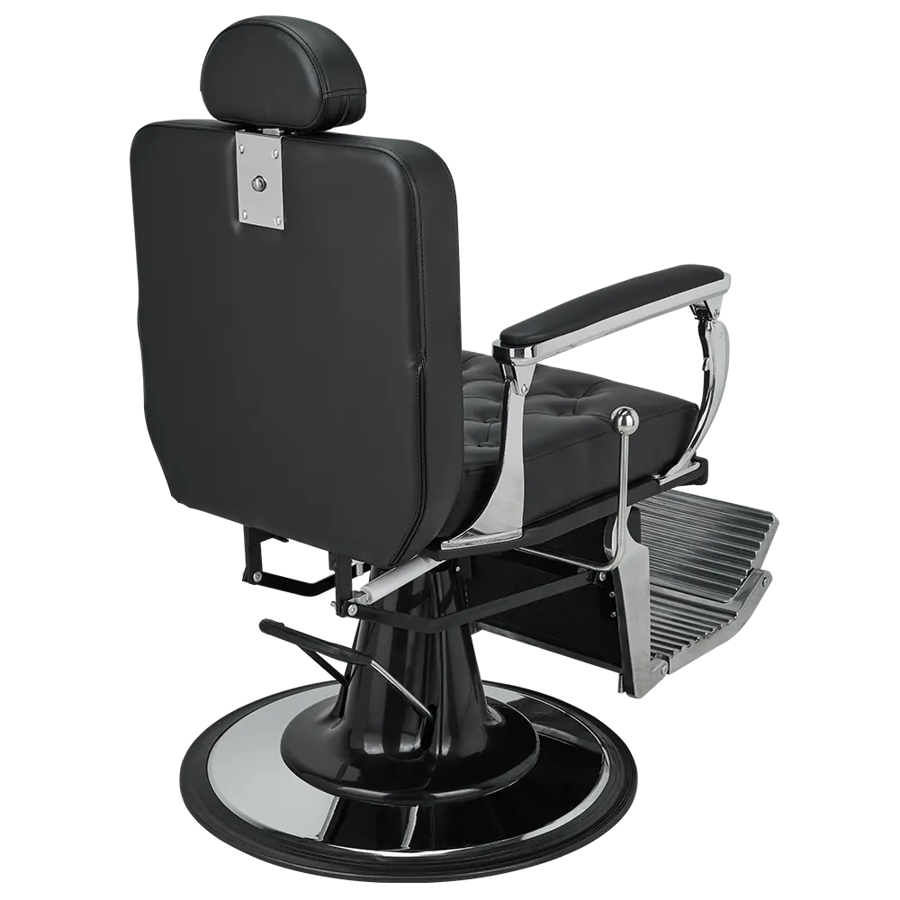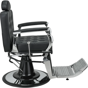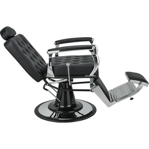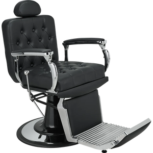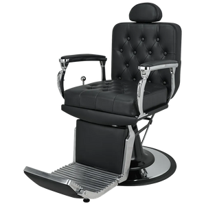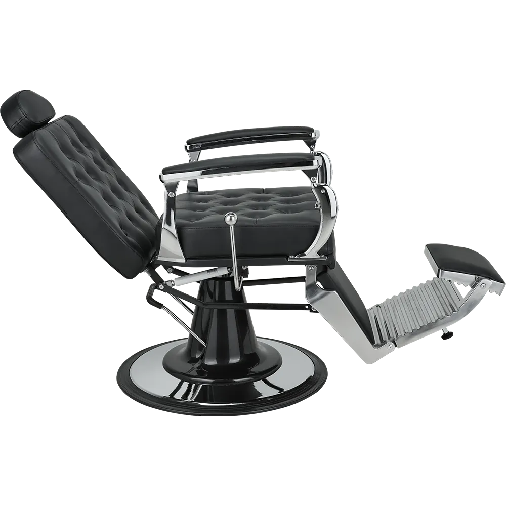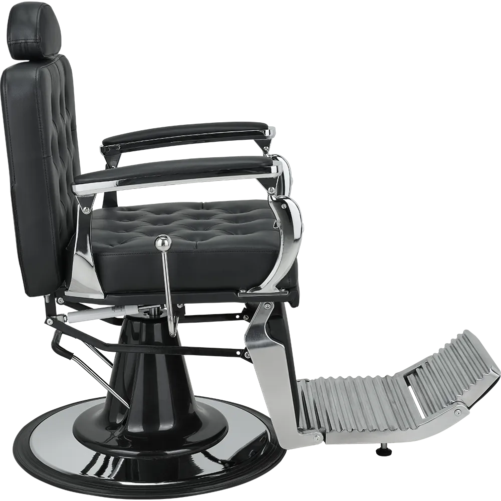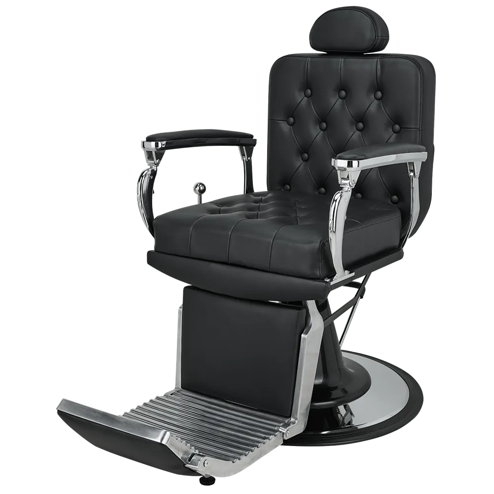 A barber chair with expressive shapes, featuring a shiny chrome frame and button-tufted upholstery that add distinctive character. The backrest adjustment handle evokes the look of a gear shift lever in classic retro cars.