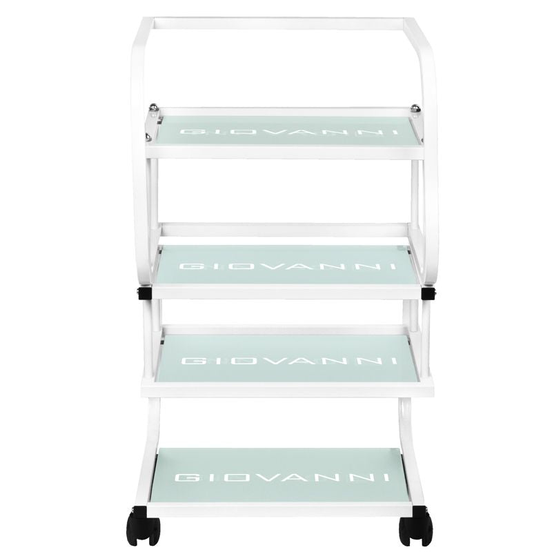 aesthetic table for a cosmetic device, made of metal and glass, with wheels. has four glass shelves.