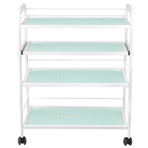 functional, metal and glass table with wheels and one pull-out shelf. this stable piece of furniture is perfect as a table for cosmetic devices. has the ability to attach a magnifying lamp and other elements.