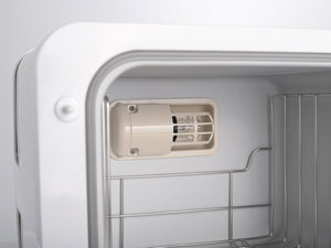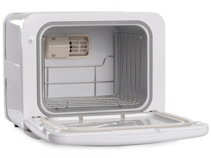 Professional towel and massage stamp warmer, equipped with a UV sterilization lamp and an integrated drip tray. Perfect for massage parlors, beauty salons, and spas. Its small size and minimalist white casing with rounded shapes will fit into any space, even a small one.