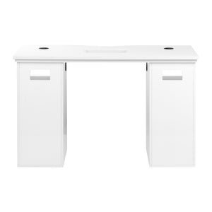Cabinets on both sides with three capacious drawers facilitate organisation and help keep your most necessary cosmetics and tools in order . As a result, everything you need is always close at hand, which promotes smooth and efficient work. Open shelves just above the drawers provide additional space - ideal for appliances or frequently used items. The desk has been fitted with special openings and cable grommets, allowing cables from devices to be routed aesthetically and neatly.