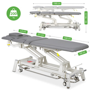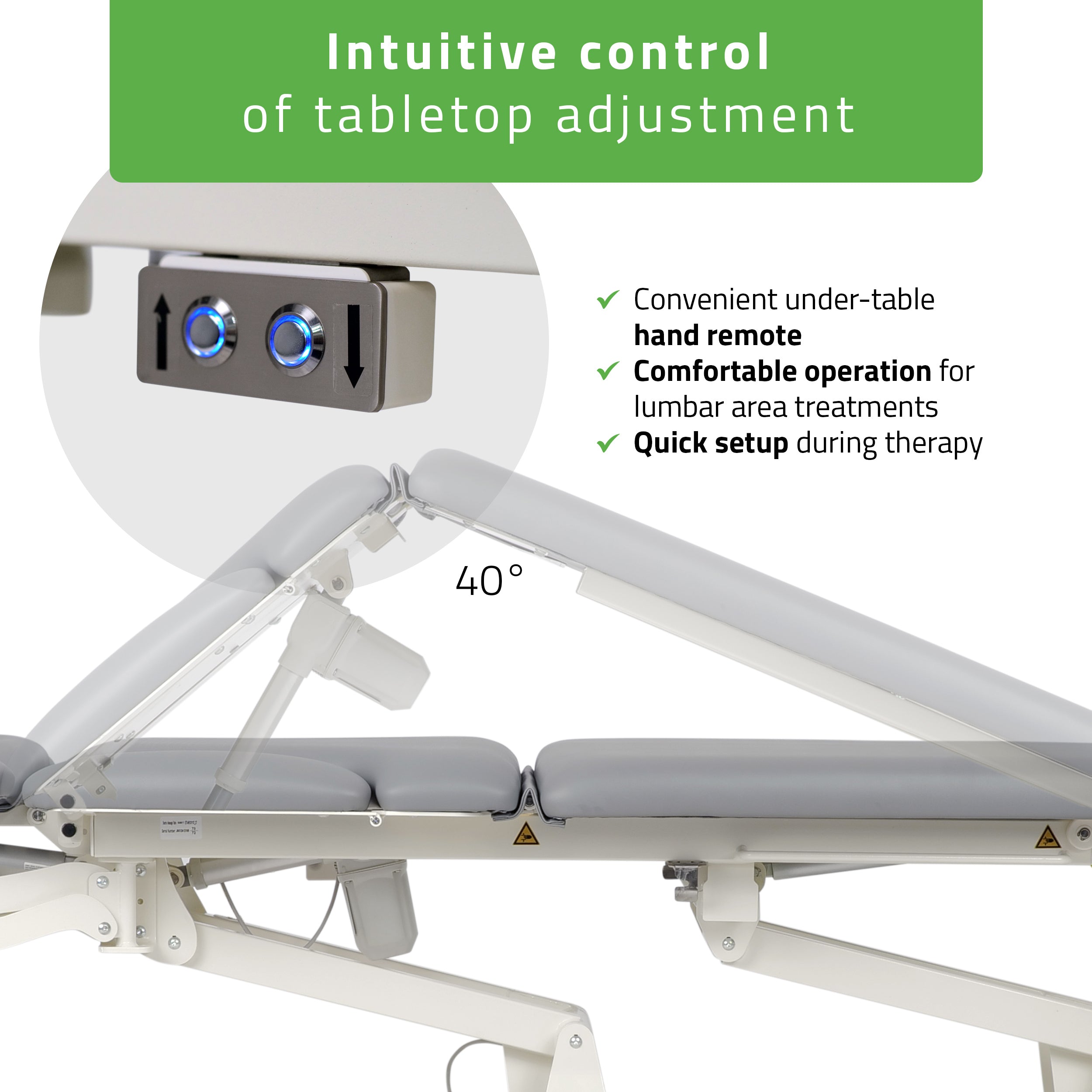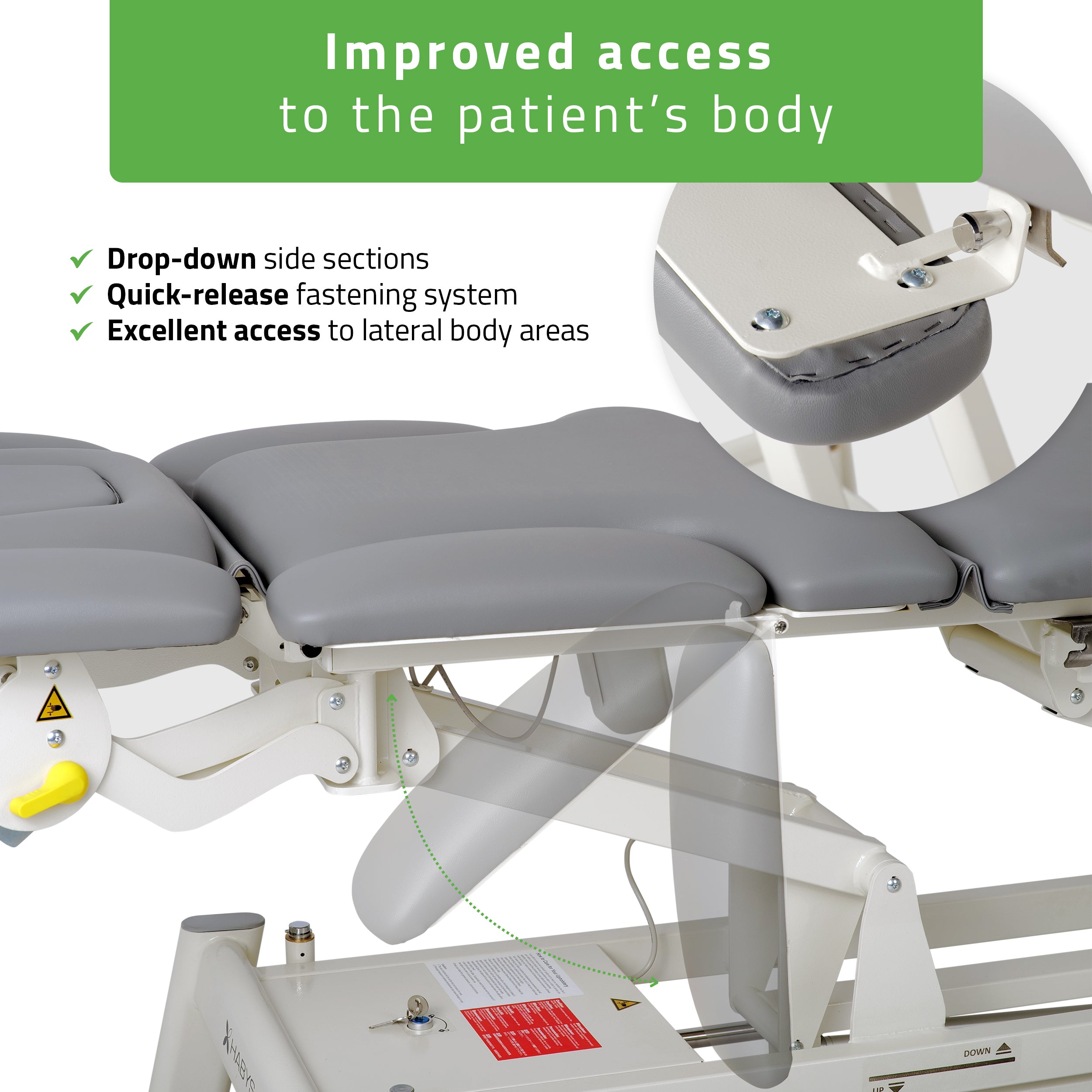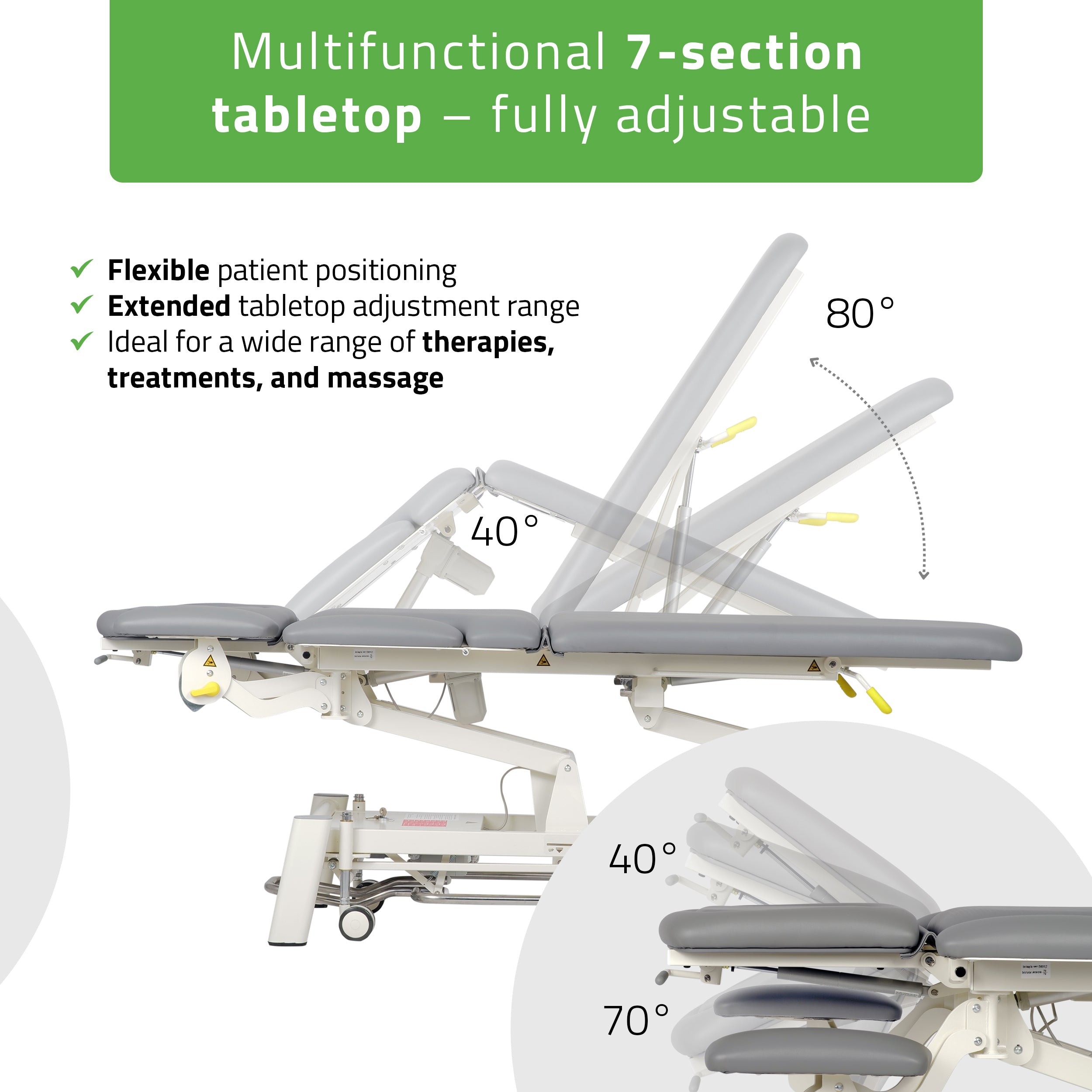 Allows precise patient positioning, which enhances treatment effectiveness and relieves strain on the therapist’s back during extended sessions.