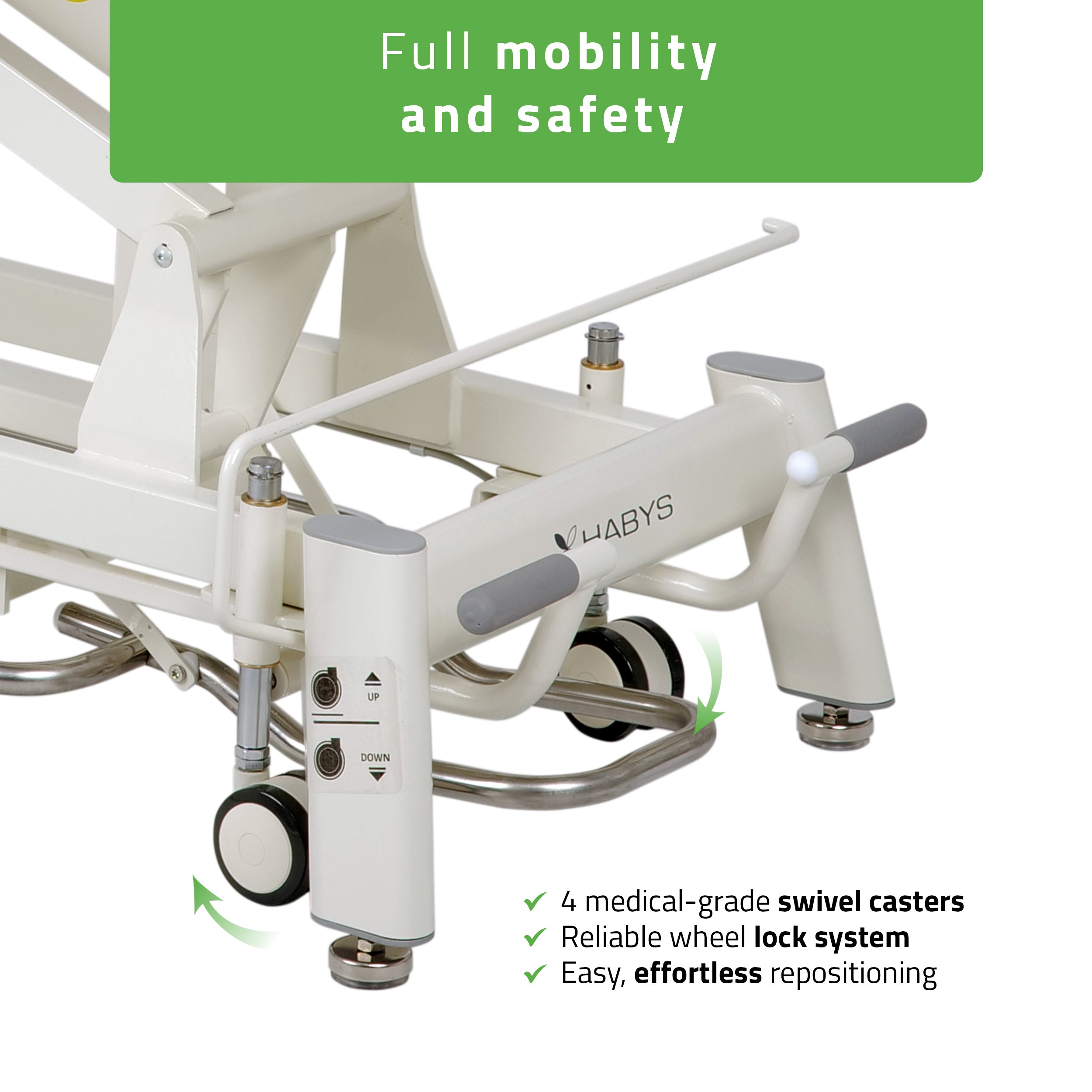 Four medical-grade swivel castors with a locking function allow effortless repositioning of the table when needed.