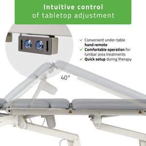 Facilitates precise pelvic and lumbar positioning - supporting fascial, mobilization, relaxation, and lymphatic drainage techniques. The hand control is located just below the tabletop, allowing for quick and intuitive adjustments without interrupting the session or altering the therapist’s body position.