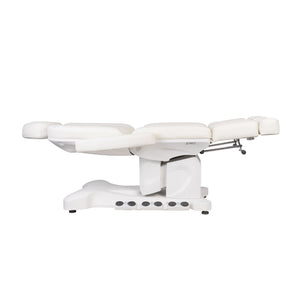A unique electric cosmetic chair, ideally suited for beauty salons and SPA salons. Thanks to independent actuators, it allows you to adjust the chair in 3 planes by means of a remote control and foot switches, giving the possibility of comfortable pedicure treatments as well as face and body treatments. By using the remote control, we can use the programmed settings and start the HOT function, i.e. heating. The armchair uses perforated upholstery, unheard of in other armchairs, and colored LED illumination of the base.
