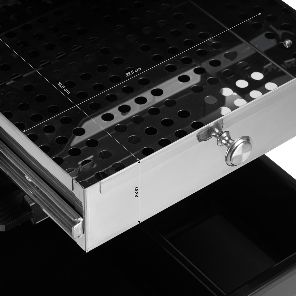 The UV-C sterilizer installed in the helper is an excellent solution that will ensure the safety of the treatments performed. It will easily and quickly clean the surfaces of tools from most pathogens. The interior of the device is made of surgical steel and is mirrored, which reflects UV rays and ensures more thorough disinfection. An efficient quartz lamp with a wavelength of 254 nm effectively destroys various forms of microorganisms. The suggested duration of the process is 10 minutes, but you can freely adjust this value within 5-30 minutes, which are counted down by the digital display.