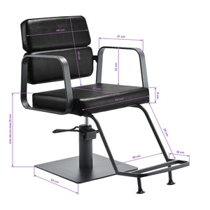 The full rotation mechanism of the chair makes the hairdresser's work more effective and comfortable. A solid, flat, square-shaped base guarantees stability during use. The matte-finished, smooth surface gives the element an elegant look and makes it easy to keep clean. A comfortable seat with foam filling ensures high comfort of use, even during many hours of treatments. Geometric, metal armrests allow for the correct positioning of the client's shoulders – this means that he does not bury his head in his shoulders or slouch – which makes it much easier to perform precise treatments, including haircuts. A stylish footrest dedicated to this model provides stable support for the user's feet.