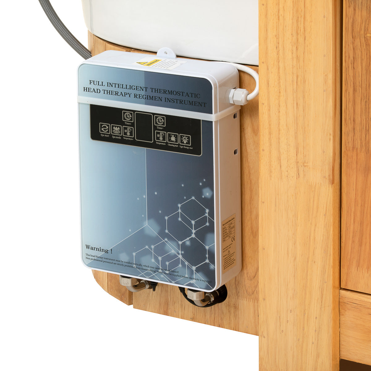 The intuitive touch panel allows for full control over treatment parameters, ensuring ease of use. It allows for adjustment of operating time and water temperature, as well as real-time monitoring of settings. The panel also allows for activation of light therapy – light in the bowl creates a relaxing atmosphere and enhancing the luxurious feel of the treatment. Additionally, the steam therapy device is equipped with a remote control for convenient operation.