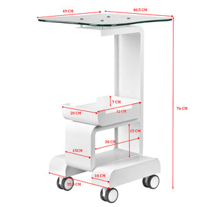 functional, metal and glass table with rubber wheels with a blocking function. Perfect as a table for a cosmetic device. it has a stable shelf for the device and another shelf for accessories, and thanks to the wheel, the table is mobile and easy to move. the piece of furniture provides convenience and comfort during work.