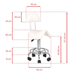 a comfortable, stable cosmetic stool with a backrest, with a profiled seat, on a five-star base with plastic wheels. available in white, a necessary piece of furniture in a beauty salon.