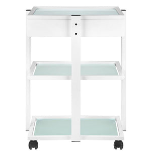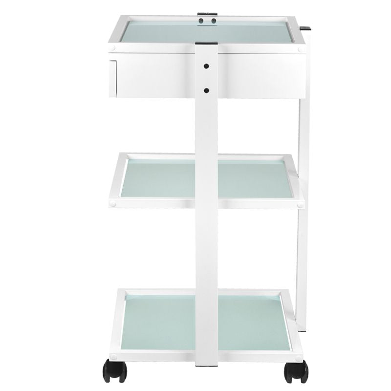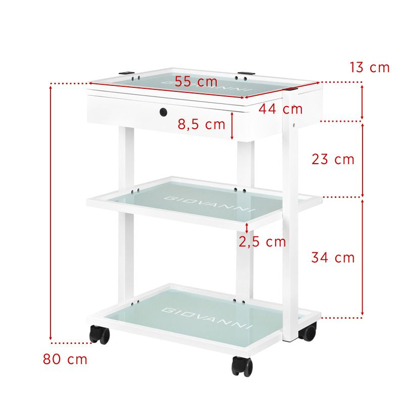 elegant metal and glass table, on rubber wheels. the table has a spacious drawer and two glass shelves with an engraved giovanni logo. it is possible to attach a lamp-magnifier to the table.