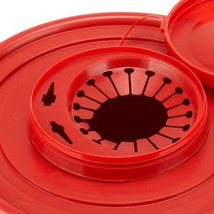 The cover is equipped with a rosette opening and two holes for separating the blades from the handles, the needles from the syringes, etc.