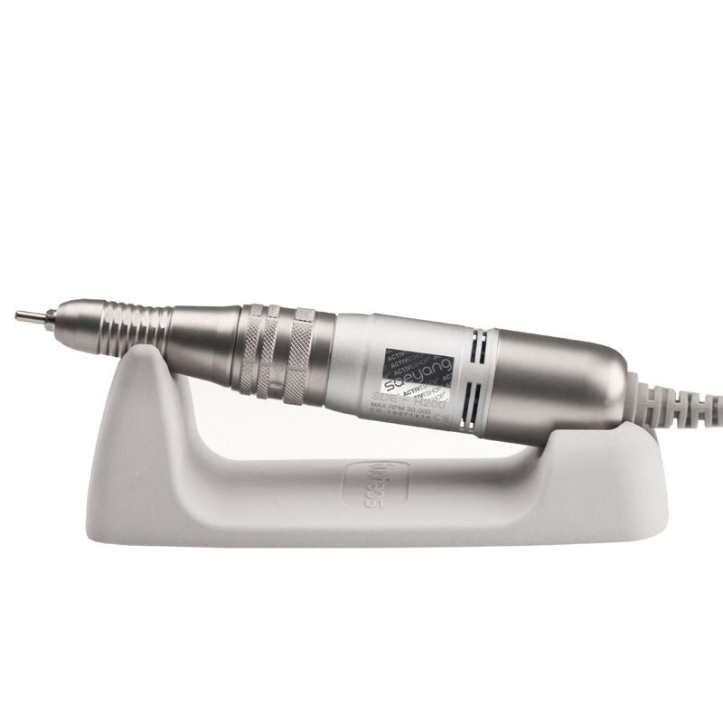 The functional H200 handpiece fits perfectly in the hand, which guarantees high comfort of work. It is equipped with an easy-to-use Twist-Lock system, which allows for quick and smooth drill bit changes. Thanks to this, working with the device is extremely easy and intuitive, which will also be appreciated by more demanding users. Pen is properly balanced and ergonomically profiled, and in addition, the vibrations of the handpiece have been reduced, so that even many hours of work with the nail drill do not tire the hand excessively. The flexible spring cable provides high comfort of work, reaching up to 135 cm in length with significant stretching.