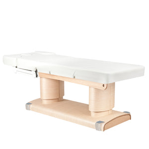 electric cosmetic bed adjustable in height in a very wide range from 64 to 82 cm. backrest, footrests also adjustable by remote control, face opening, support columns controlled independently. a wide piece of furniture (76 cm), with a thick and very comfortable and heated mattress. the bunk is very stable. it is upholstered with high-quality eco-leather in a delicate ecru shade.