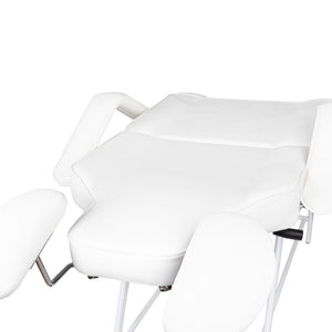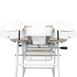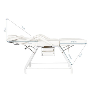 the chair has a manual adjustment of the footrest, backrest and arm support for the operator. the hand support used is an extremely practical solution not found in other armchairs. equipped with a comfortable pillow for the client and handy litter boxes for placing the necessary accessories.