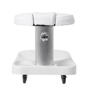 The footrest is made up of three parts, of which the middle one is extendable. Manual height adjustment allows it to be raised by a maximum of 20 cm. All elements of the footrest are upholstered with synthetic leather, which ensures resistance to moisture and ease of cleaning. As a result, the trolley can be adjusted to the individual needs of the user, which makes it an excellent solution for both cosmetic and podiatric treatments, ensuring comfort and precision of work in various positions.