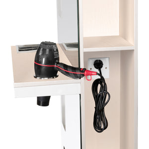 a modern hairdressing console with a large mirror and handy shelves on both sides. the contents of the shelves on one side are visible through the top-class finish "windows". an elegant and at the same time universal element of the interior that will emphasize the character of any living room.