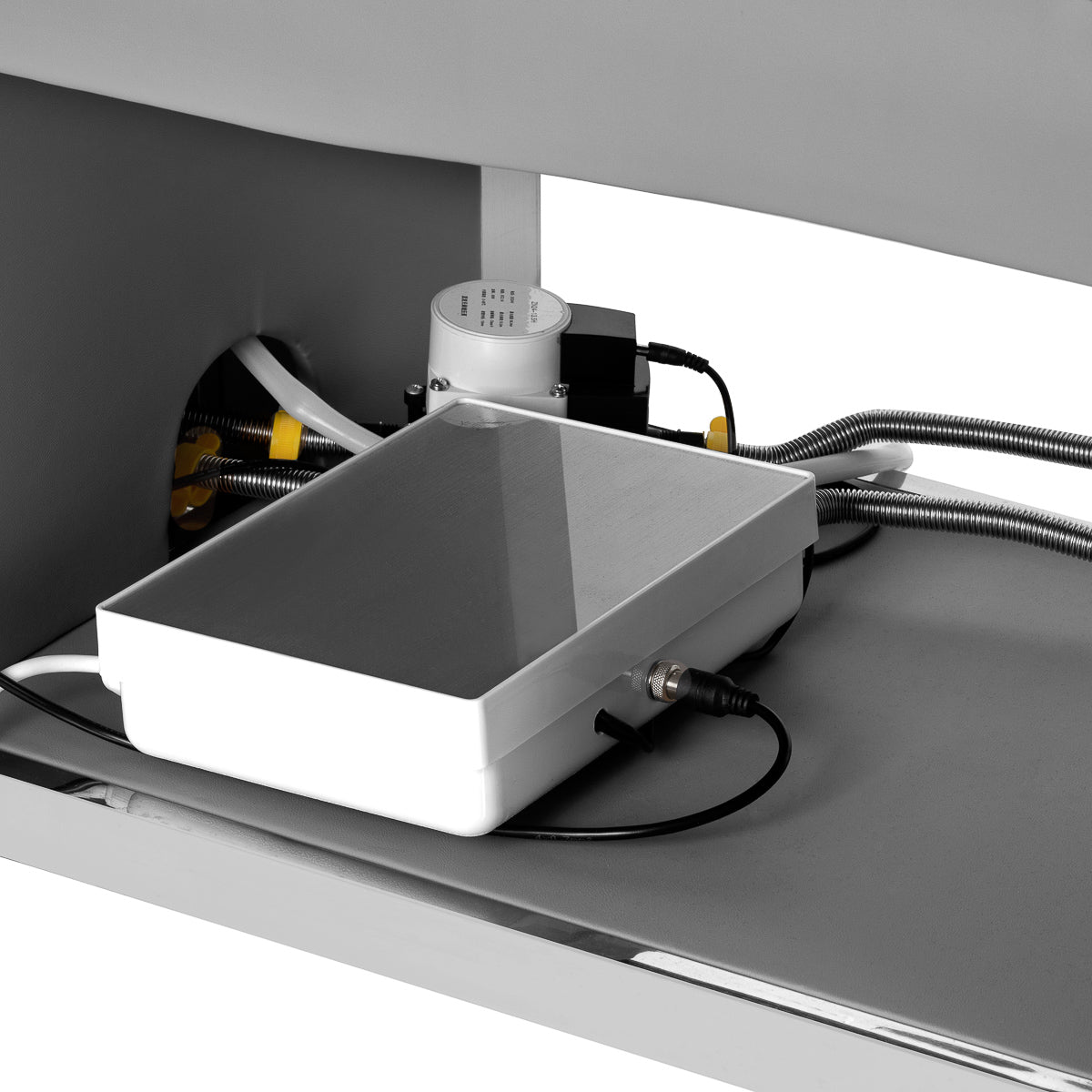The hair wash unit is equipped with a mixer tap, which allows easy adjustment of the temperature to the customer's preferences. A dedicated place for the shower head makes work easier, and a chrome plug with a special strainer allows you to control the water flow and maintain high hygiene standards in the salon. The water connection is placed inside the base, which allows for efficient hiding of all pipes. The lounger is profiled in such a way as to provide comfort during various treatments. The combination of functionality and amenities makes work in a hairdressing salon or SPA even more comfortable.