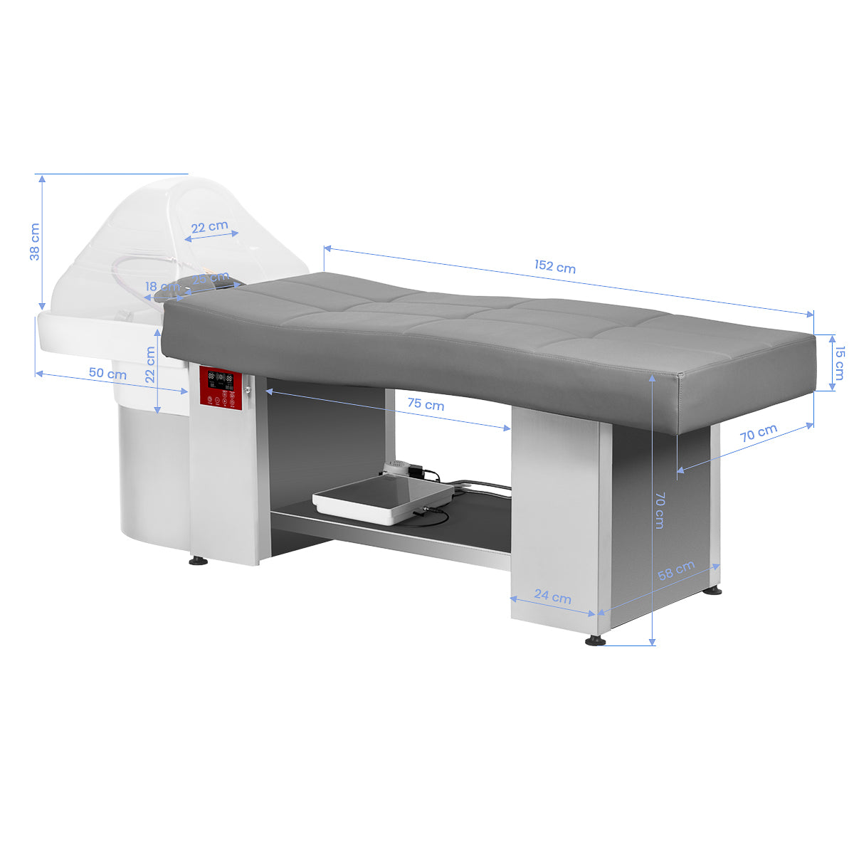 The elegant Gabbiano Head Spa 017 cosmetic bed with integrated wash unit is an innovative SPA bed, designed for professional care and relaxation treatments. It is ideal for treatments of the luxurious Japanese Head SPA, offering a wide range of therapies for the scalp and hair. It allows you to combine hydrotherapy techniques, water jet massage, aromatherapy and light therapy, providing a holistic care experience. The advanced technologies and ergonomic design provide not only unparalleled comfort for customers, but also facilitate the work of specialists in the beauty & wellness industry. The Gabbiano Head Spa 017 is a unique combination of tradition and modernity, which provides deep relaxation, nourishment and hydration of the scalp and hair. Additionally, it can be used for body massage, offering versatile therapeutic and relaxing possibilities.