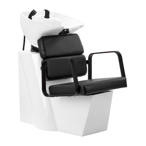 The appropriate depth of the white ceramic washbasin bowl prevents excessive splashing of water or products used during treatments. This allows for comfortable and effective performance of a wide range of services. The angle of the bowl can be adjusted, making it easy to adapt to individual needs. The high quality of the materials used makes the washbasin durable, resistant to discoloration and scratches, and very easy to clean. A properly profiled collar and inclined backrest provide support and comfort when washing the hair, and thanks to the comfortable black plastic overlay, the customer will not feel the unpleasantness of the cold ceramic surface.