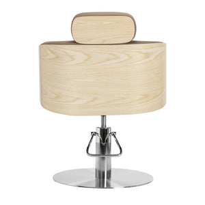 The Gabbiano Wratislavia hairdressing chair combines minimalist design with functionality and comfort for everyday use. Wooden elements on the outside of the structure add warmth and style, while the streamlined shapes add give it a light and modern character. The stable, round base in shades of chrome emphasizes its modern character, while the soft foam filling combined with the pleasant-to-the-touch synthetic leather in shades of taupe guarantees comfort even during long treatments. Carefully selected materials make it durable, moisture-resistant, and easy to clean. It fits perfectly into both modern and classic interiors, emphasising the professional character of any salon.