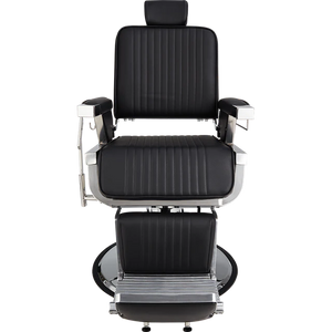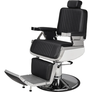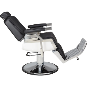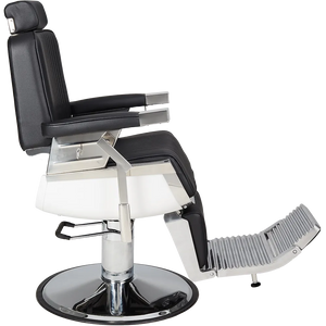 An elegant chair for the modern barbershop. The white seat casing combined with a sleek chrome base creates an impression of lightness, while the vertical stitching on the black upholstery adds a touch of class. Black upholstery