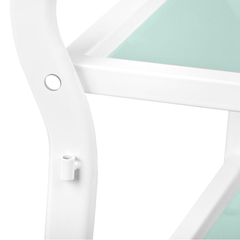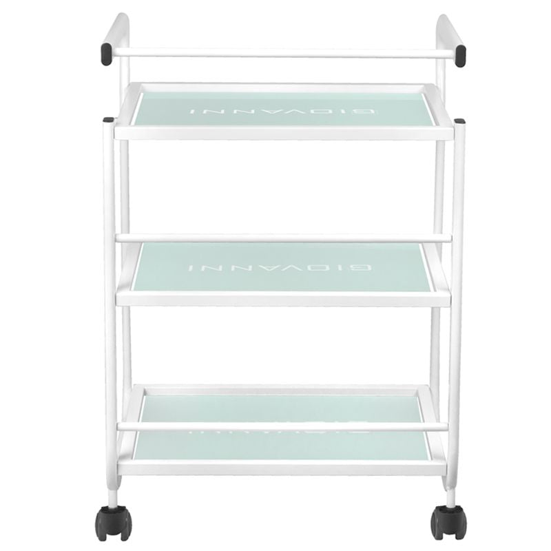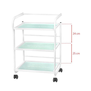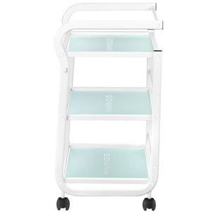 table for a cosmetic device, made of metal and glass, with wheels. has three glass shelves.
