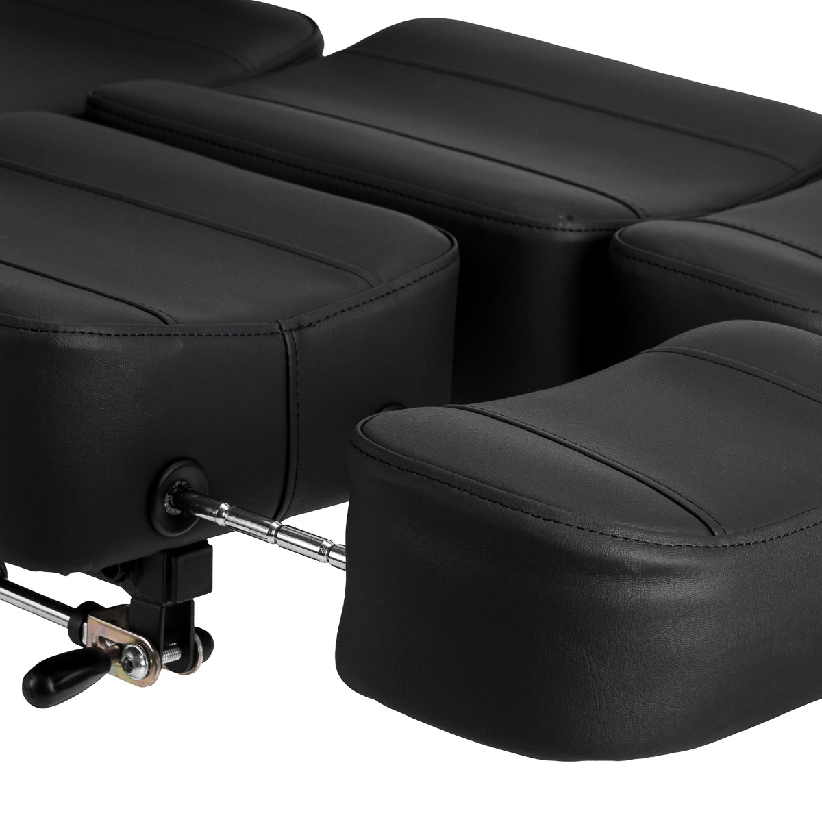 The full rotation mechanism with a lock function provides exceptional functionality, facilitating easy access to the client from all sides and improving work even in confined spaces. The chair's design allows it to be reclined to a comfortable position, and the opening in the headrest, hidden under the cushion, provides adequate support and comfort during treatments in various positions. An additional convenience is the leg rest, which allows for comfortable straddling, and its extension adjustment allows it to be adapted to the needs of users of different heights.