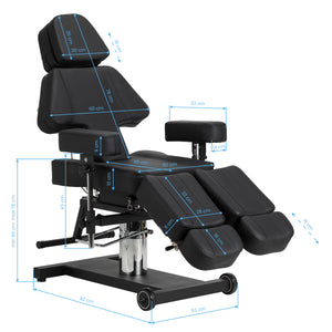 The seat height is adjustable by hydraulic lift in the range of 60-78 cm, while when fully extended, the chair reaches a length of up to 200 centimetres. Manual adjustment of the backrest and footrest angles allows you to adapt the position to the specific treatment being performed. The split footrest with independent segment adjustment and side adjustment allows for individual leg positioning, increasing freedom of movement and client comfort. The extendable part of the footrest provides stable support even for taller people. Removable armrests with height and angle adjustment increase the number of possible settings, making it easier to adjust the chair to current needs. The whole creates an ergonomic and functional solution, perfectly suited to the realities of working in a professional tattoo studio.