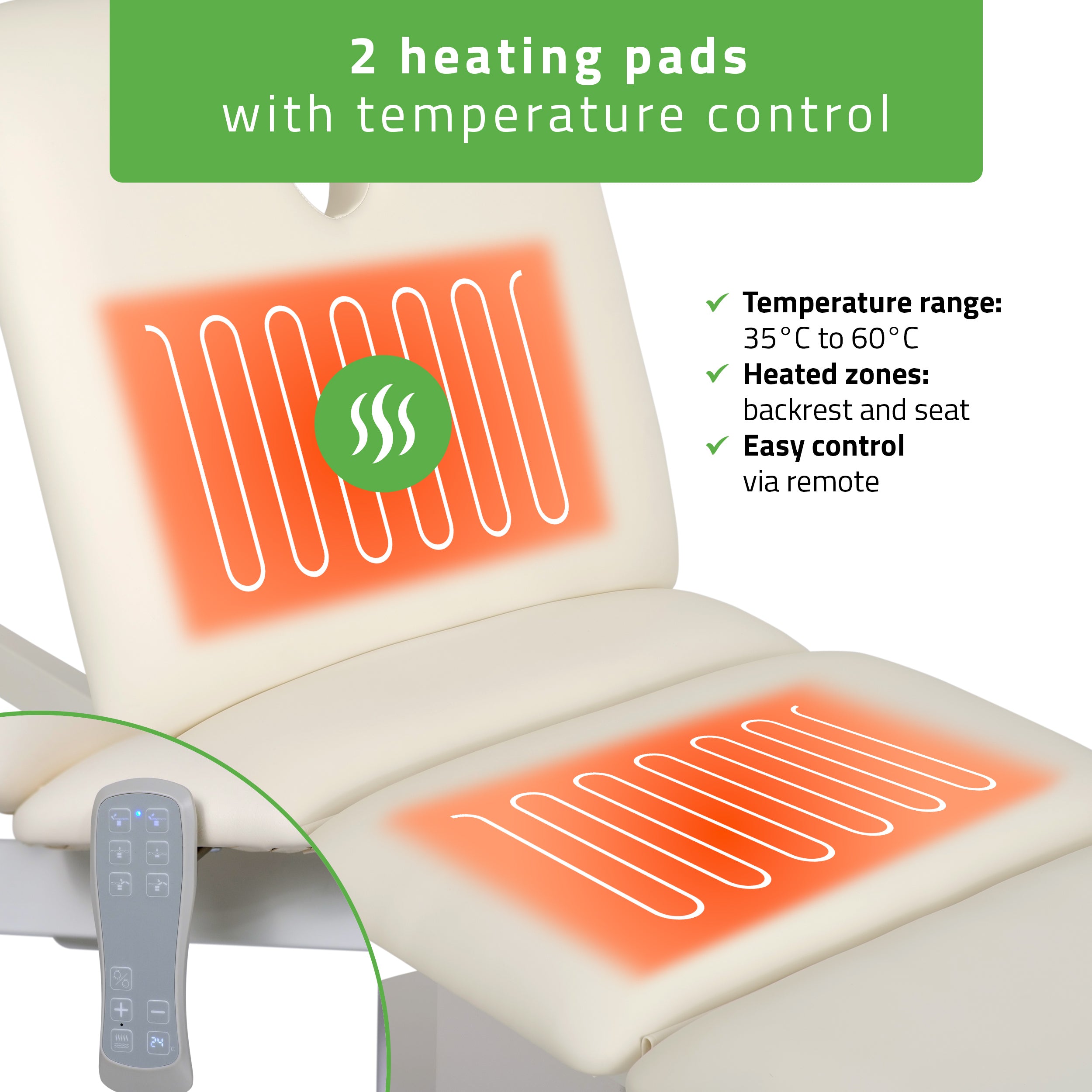 Integrated heating mats in the seat and backrest provide warmth and comfort—especially appreciated during relaxing, skincare, or waxing procedures.