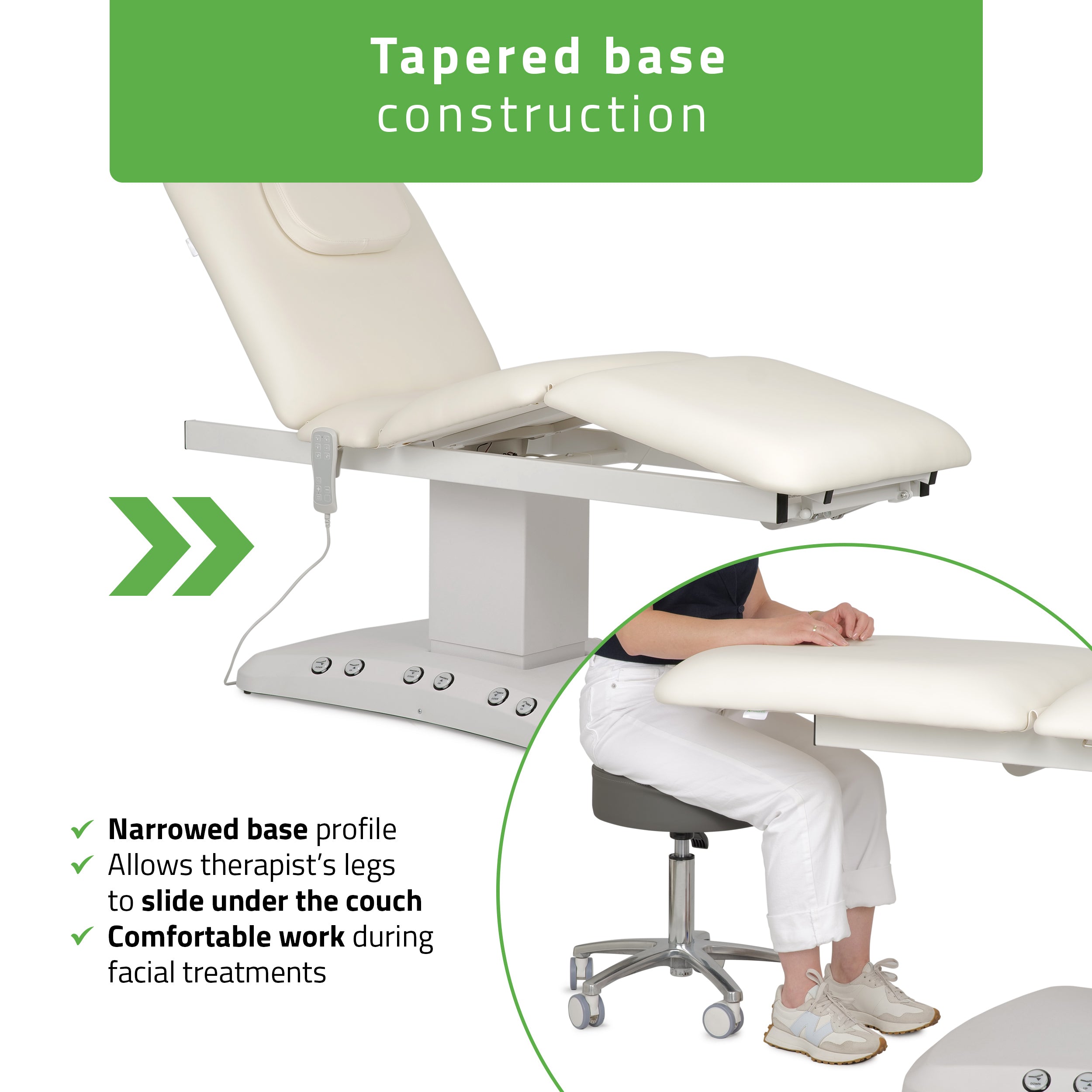 Allows easy access to the headrest and natural leg positioning, facilitating precise treatments.