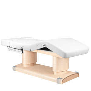 electric cosmetic bed adjustable in height in a very wide range from 64 to 82 cm. backrest, footrests also adjustable by remote control, face opening, support columns controlled independently. a wide piece of furniture (76 cm), with a thick and very comfortable and heated mattress. the bunk is very stable. it is upholstered with high-quality eco-leather in a delicate ecru shade.