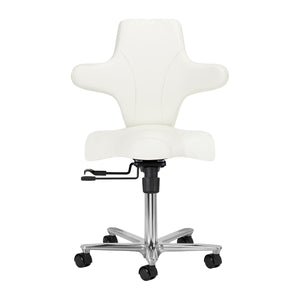 The possibility of adjusting the height in the range of 55-75 cm allows you to take the appropriate position while performing services. The side projections allow you to support your hands when sitting backwards on the chair, especially during services such as massage or makeup. Full rotation mechanism makes work more effective and convenient. The chair also has a lockable cradle function, which allows for ergonomic body positioning while working. The seat extension can also be manually adjusted.