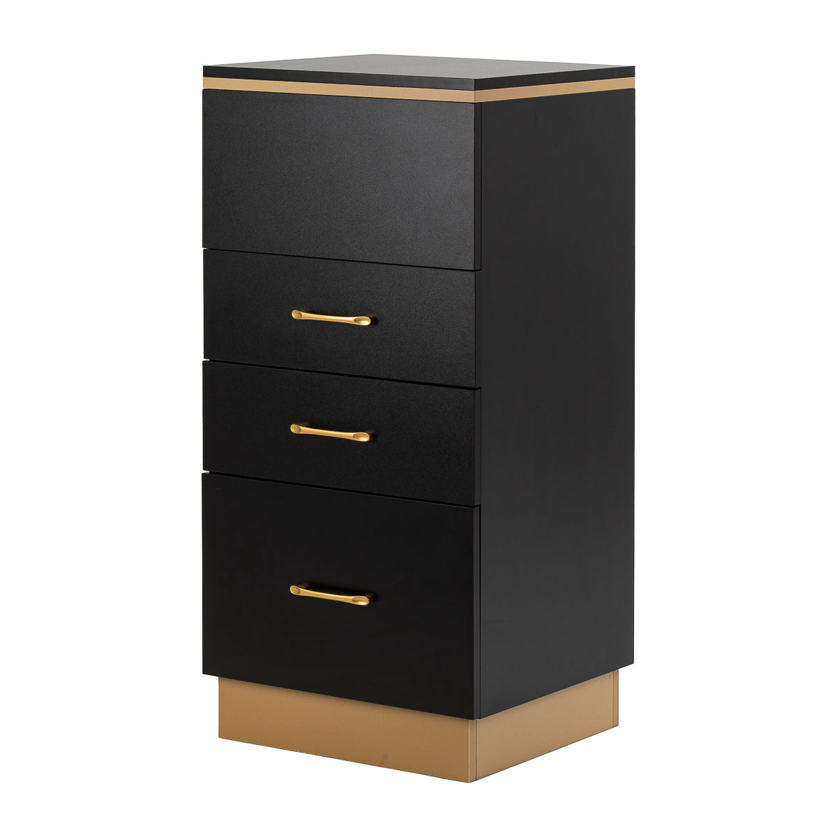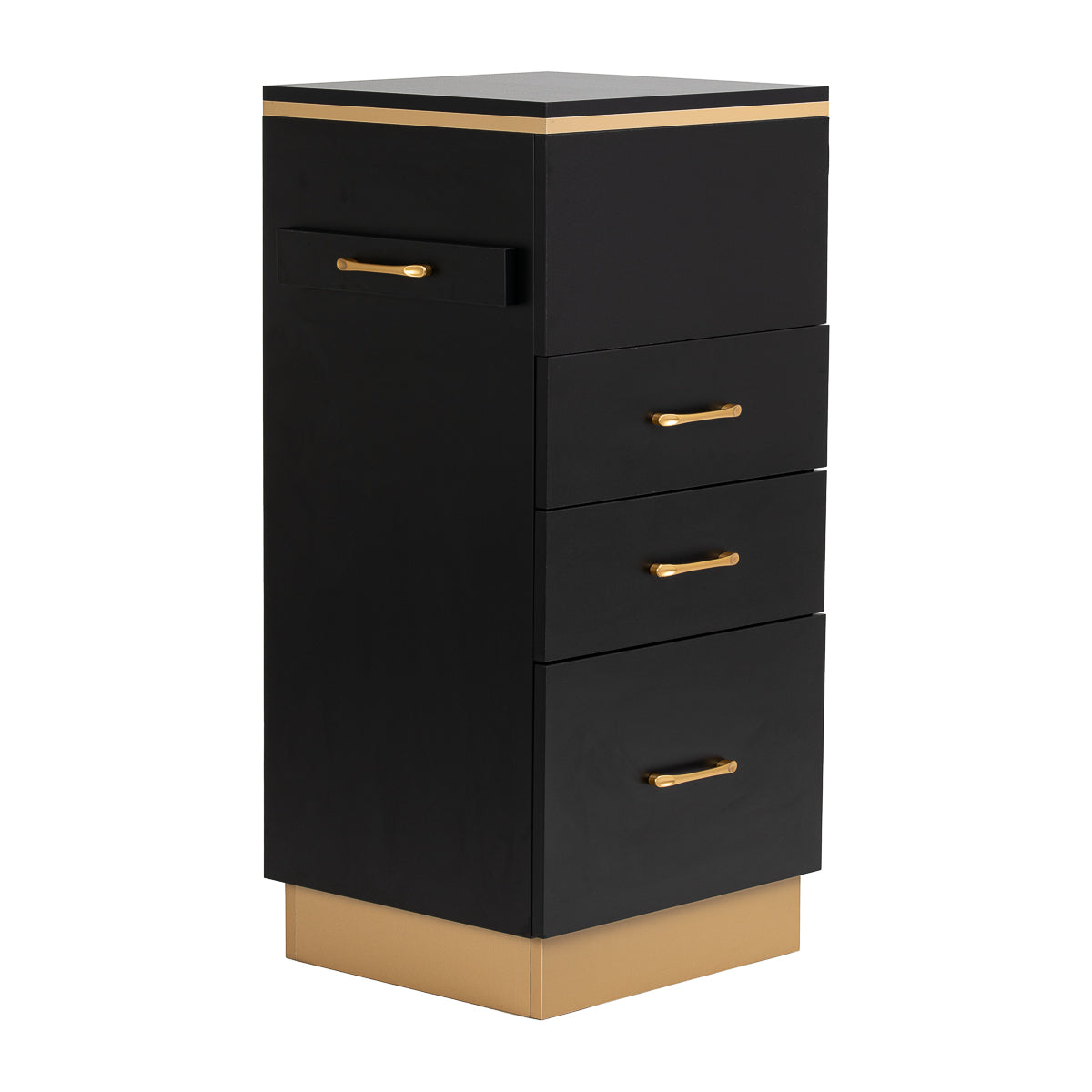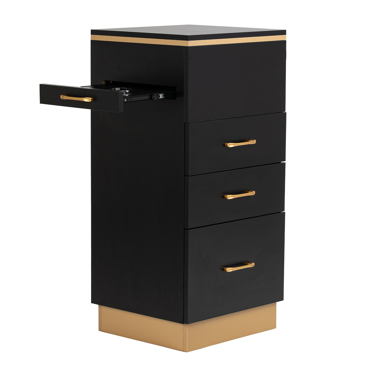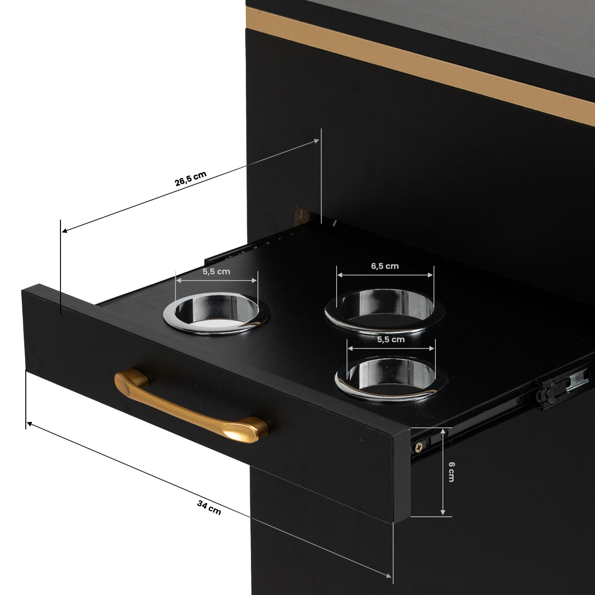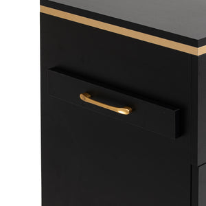 The combination of classic black and gold gives the helper a modern, prestigious character, which fits perfectly into both minimalist and more expressive arrangements. The solid construction ensures stability, while the smooth surface makes it easy to keep the furniture clean. The gold handles not only emphasise the elegant design, but also ensure convenient opening of each drawer. It is a practical solution for a hairdressing salon, where order, convenient access to tools and aesthetics of the workstation matter.