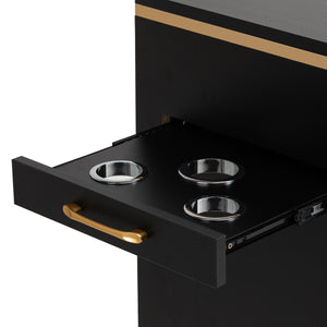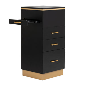 The Gabbiano 2027G hairdresser's helper is an elegant piece of equipment which will emphasise the character of a professional interior and improve everyday work organisation. The furniture is distinguished by a minimalist form in shades of black with gold details, which gives it a unique, luxurious look.
