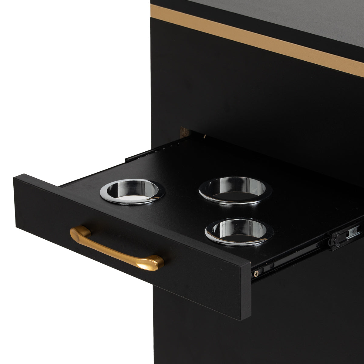 The helper has an additional side pull-out drawer with metal tool holders. The three openings are perfect for holding hair dryers, curling irons, straighteners or brushes, allowing you to conveniently store your equipment during treatment. This solution provides free access to the most necessary tools without putting them away on the work surface.