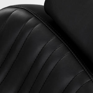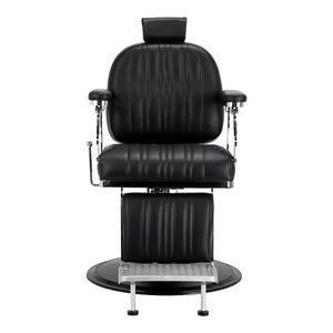 The stable base provides secure support and high comfort of use. The seat is filled with deformation-resistant foam and upholstered with semi-matt synthetic leather, guaranteeing durability and comfort for a long time. The materials are distinguished by their resistance to moisture and ease of cleaning. The black upholstery combined with metal chrome elements and a decorative footrest give the chair a distinctive, classic character. Vertical stitching emphasises the vintage style, which fits perfectly into the atmosphere of professional barbershops. Carefully refined details give the whole a representative look, and the functional design promotes comfortable and effective work.