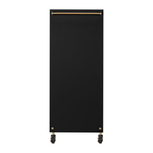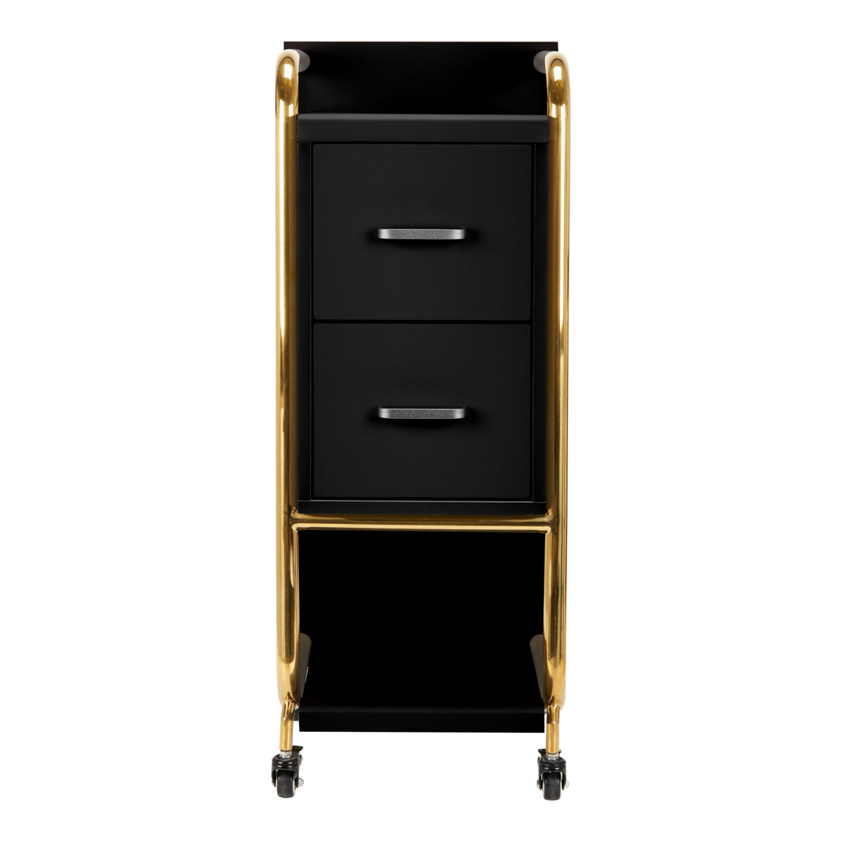High-quality Gabbiano Solo hairdressing assistant is an elegant piece of equipment, that significantly improves work in the hairdressing salon. Two spacious drawers and two shelves of different sizes significantly facilitate the organization of products and necessary tools. Rubberized wheels with brakes ensure adequate mobility, which allows for placing furniture anywhere in the hairdressing salon. Elegant design – polished metal elements in shades of gold and stable structure made of wooden boards in shades of black – will perfectly emphasize the character of the interiors.
