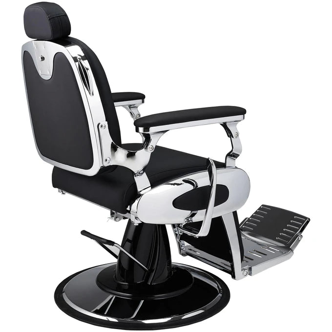 It can easily become the centerpiece of any hair salon. The very essence of a traditional Barber Shop. Fully reclining, featuring a swivel footrest and plenty of chrome details. Its distinguishing features are the button-tufted backrest and the upholstered insert on the seat casing. Black upholstery