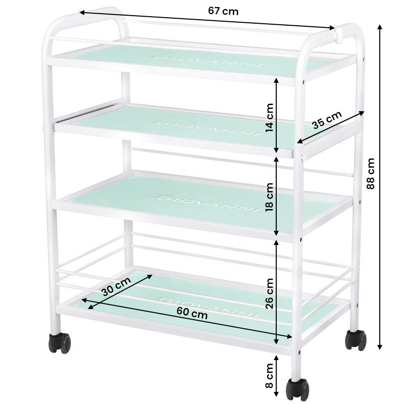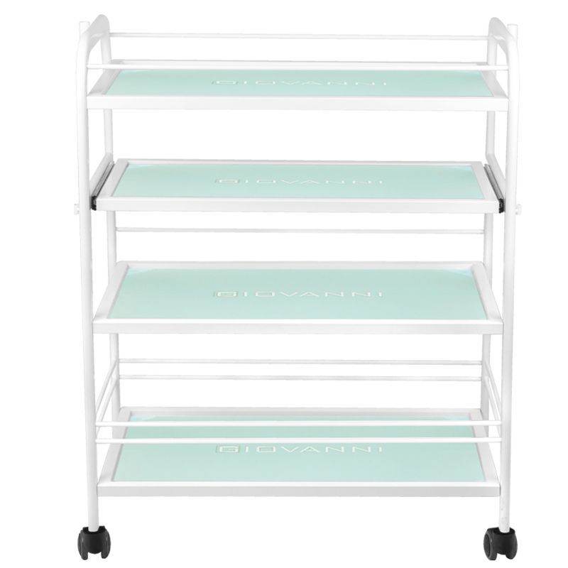 aesthetic table for a cosmetic device, made of metal and glass, with wheels. has four glass shelves.