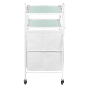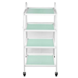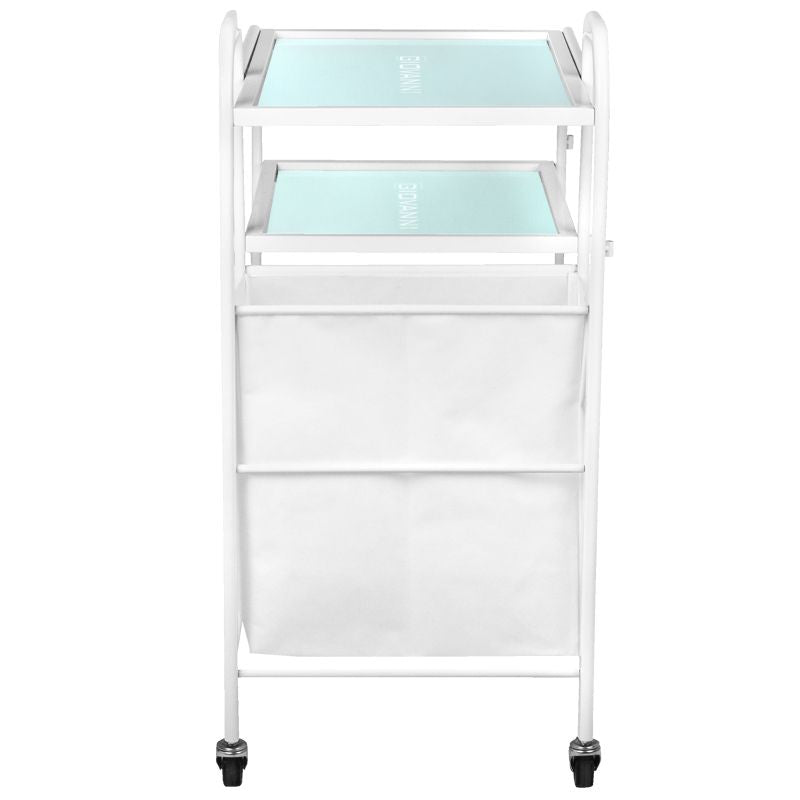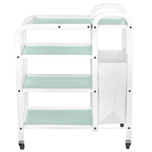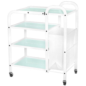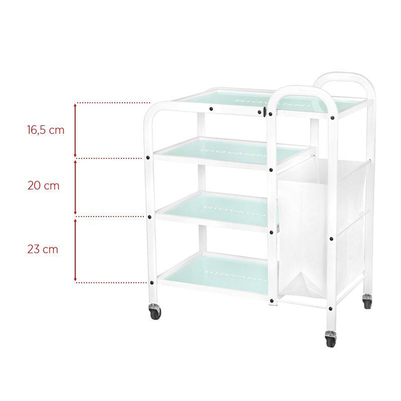 functional metal and glass table on rubber wheels. the table has four glass shelves with an engraved giovanni logo. an additional advantage of the table is a bag for dirty towels and cosmetic bands attached to it.