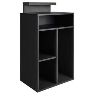 TINA is the most popular mini reception desk in our range, designed for hair and beauty salons. It’s simple, timeless form fits perfectly into Scandinavian interiors as well as more classic or modern spaces. This compact piece offers four practical open shelves to hold all essential accessories. Made of durable laminated board – available immediately in a white and dark wenge combination, and on order in any décor from our collection. Body made of black laminated board