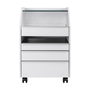 The narrow upper glass shelf allows for convenient storage of the most frequently used accessories. The cabinet is equipped with four drawers of various sizes, which facilitates the orderly storage of tools and cosmetic products. The mirrored bottom of one of the drawers and a dedicated internal organiser facilitate better organisation of tools, ensuring quick access to essential accessories and increasing comfort during treatments. The height of the upper open drawer allows you to place essential equipment, such as a nail drill with an absorber.