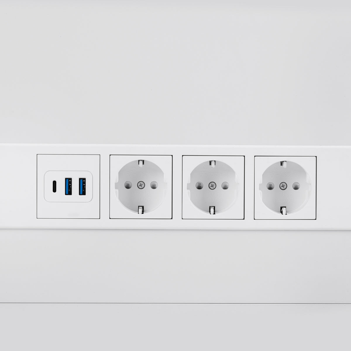 The assistant has a rear panel with three network sockets, two USB ports and one USB-C port, allowing for convenient connection of various types of devices. Cable grommets located in the walls near the top drawer help to keep things tidy. The integrated magnifying lamp holder allows the lamp arm to be securely mounted close to the treatment area without taking up space on the worktop, promoting precise lighting and ergonomic working.
